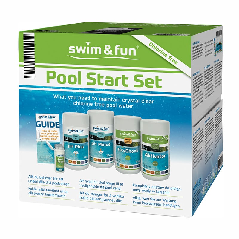 Dette settet kan passe bra for deg som ikke ønsker å ha klor i bassenget. Med startsettet er du sikret en problemfri start på badesesongen. Settet inneholder følgende: