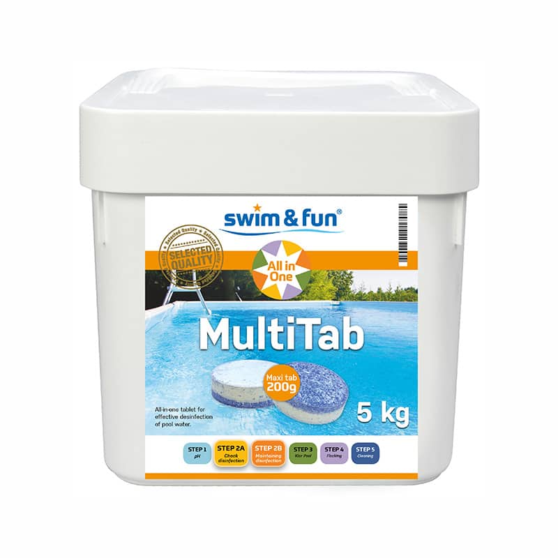 MultiTab 5KG er perfekt for opprettholdelse av et hygienisk og rent bassengvann, uten å måtte legge ned en stor innsats. Tabletten løser seg opp i 2 faser og desinfiserer først bassengvannet med hurtigoppløselig klor, før den deretter holder vannet fritt for mikroorganismer og organisk forurensning ved å gradvis utløse klor. Pakken kommer med 25 tabletter (5KG).
